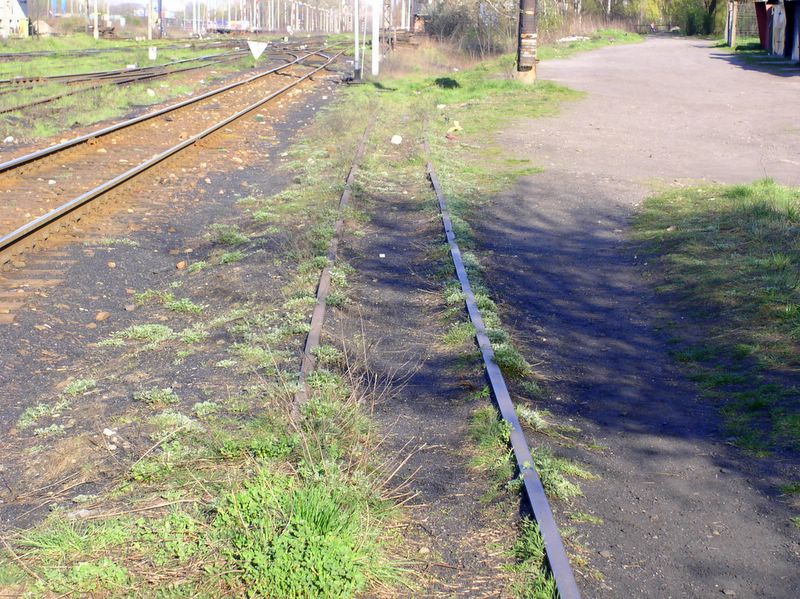 Tor wąski przecięty był bocznicą normalnotorową z Gzutu. Widok w stronę linii kolejowej.