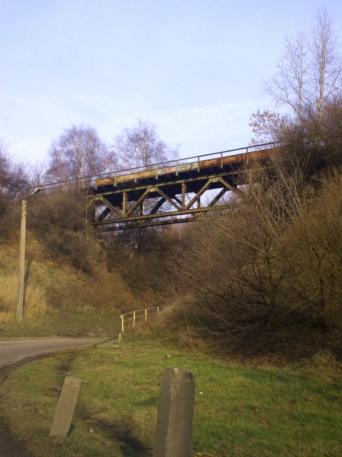 Resztki wiaduktu nad nieistniejącą linią kolejową. Wiadukt wąskotorowki z nieistniającej brykietowni. Stan na rok 2006